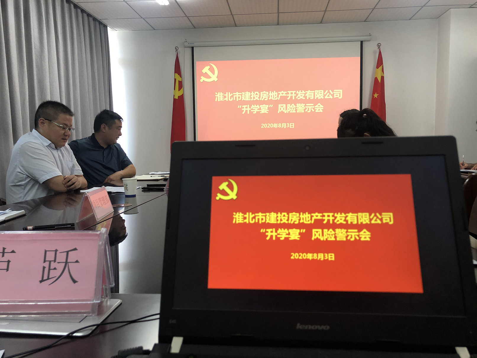 為狠剎“升學宴”等不正之風,8月3日,房地產公司組織召開“升學宴”風險警示會,堅持把紀律和規矩挺在前面,劃紅線、敲警鐘,提前“亮紅燈”給“升學宴”去火降溫。