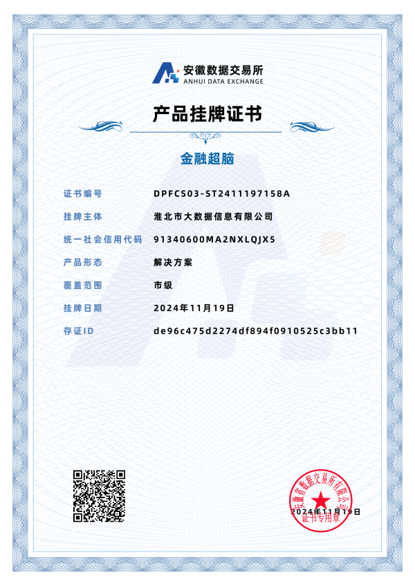自2024年9月20日安徽省數(shù)據(jù)交易所揭牌成立以來,淮北市大數(shù)據(jù)信息有限公司積極和省數(shù)交所對接,分析調(diào)研數(shù)據(jù)要素流通市場,交流探討數(shù)商合作生態(tài),研究探索數(shù)字產(chǎn)品掛牌交易。近期,我司金融信貸服務(wù)解決方案方向的數(shù)據(jù)產(chǎn)品“金融超腦”在交易所成功掛牌,實現(xiàn)了公司乃至淮北市數(shù)據(jù)產(chǎn)品在省數(shù)據(jù)交易所零的突破。為推進我市數(shù)據(jù)要素市場化改革、助力經(jīng)濟社會高質(zhì)量發(fā)展、發(fā)揮數(shù)據(jù)乘數(shù)效應(yīng)增磚添瓦。