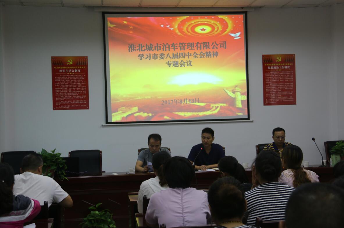 8月13日下午18時,淮北城市泊車管理有限公司召開全體人員專題會議,傳達學習市委八屆四次全會精神,研究部署貫徹落實全會精神的有關舉措。